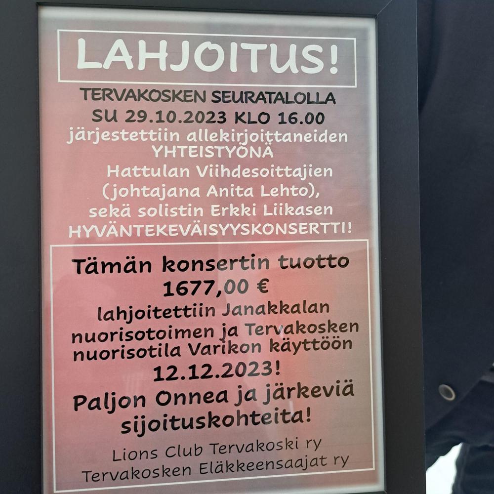 Lahjoittajina olivat konsertin järjestäjät Tervakosken Eläkkeensaajat ja Lions Club Tervakoski.