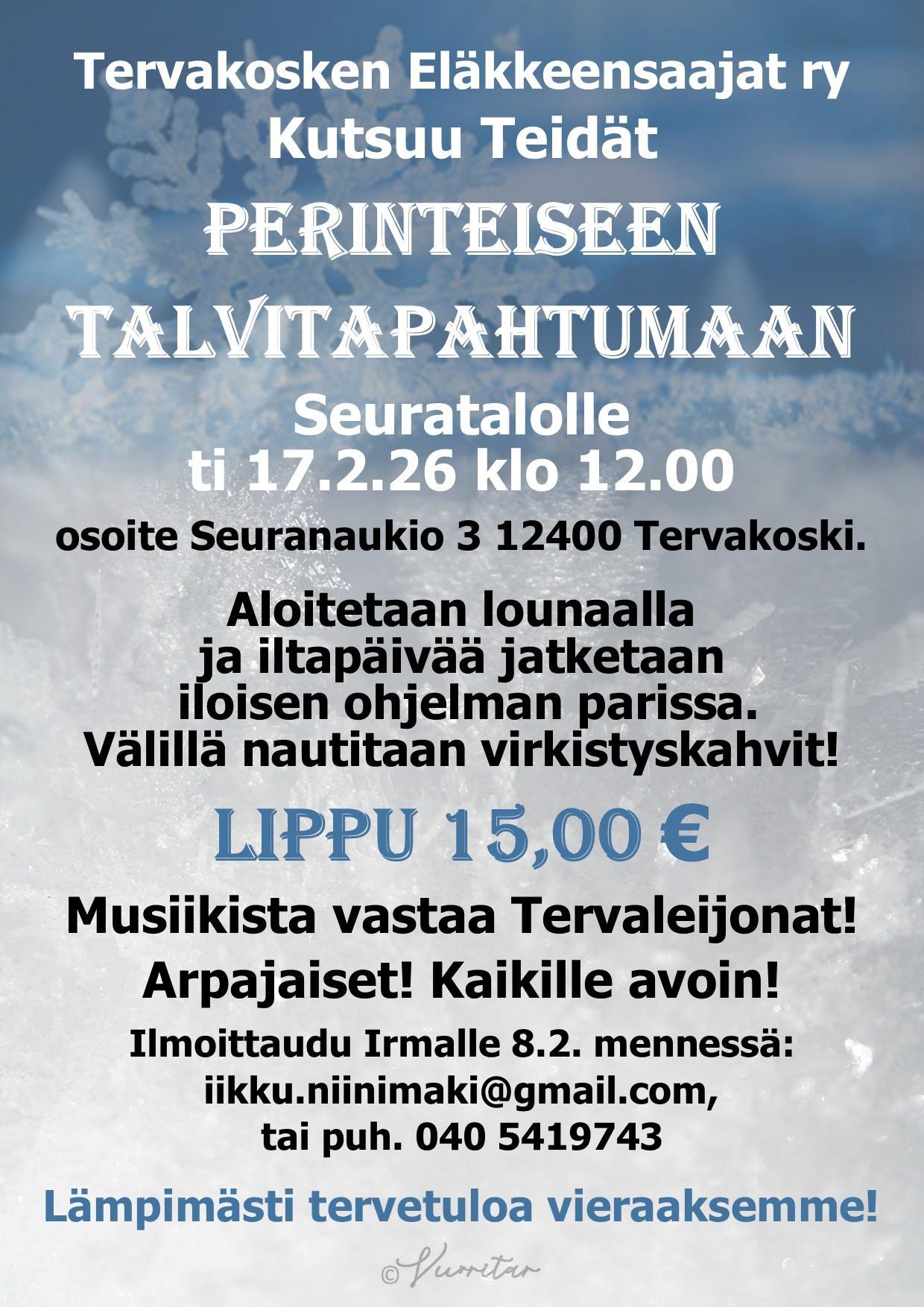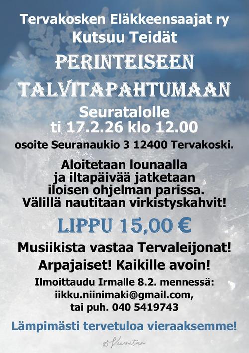 Perinteinen talvitapahtuma pidettiin laskiaistiistaina Tervakosken seuratalolla. Paikalla oli useista yhdistyksistä jäseniä sekä piirin vpj . Raimo Hyövälti.